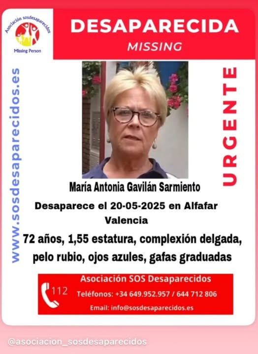 La mujer desaparecida desde el pasado 20 de mayo se llama María Antonia Gavilán Sarmiento, tiene 72 años, mide 1,55 cm de estatura, es de complexión delgada, tiene el pelo corto de color rubio, los ojos azules y lleva gafas graduadas.
