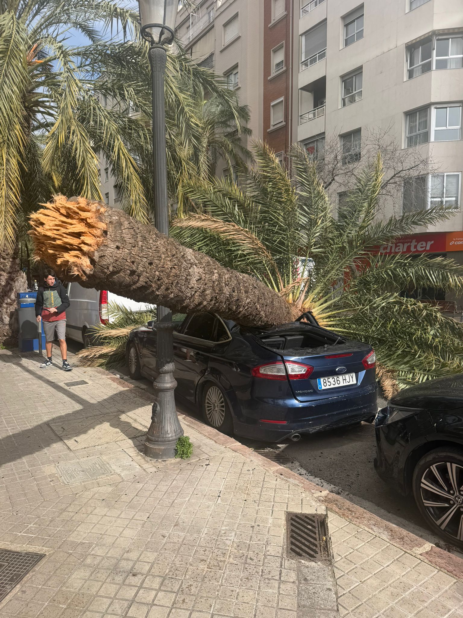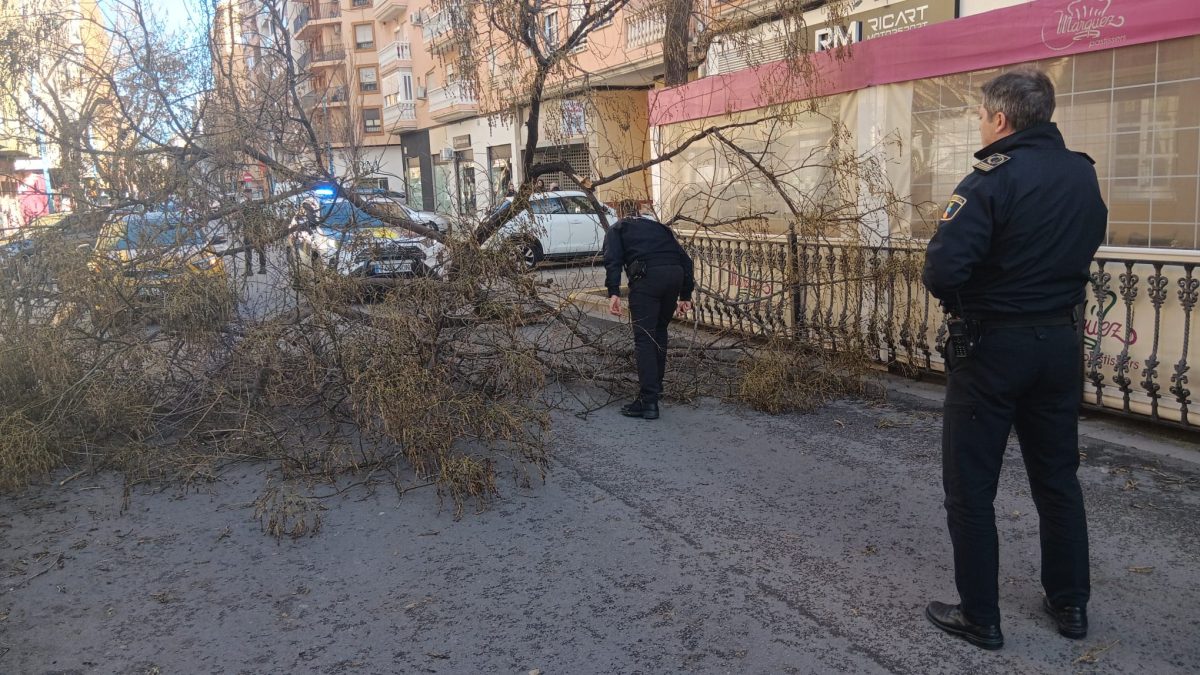 Poco después, a las 14:00 horas, en el cruce de la calle Quevedo con Guillem de Castro, una farola se ha partido por la mitad debido a la fuerza del viento, golpeando a un hombre de 55 años. Los servicios médicos del SAMU lo han asistido por una contusión en la espalda y ha sido evacuado al Hospital General.
